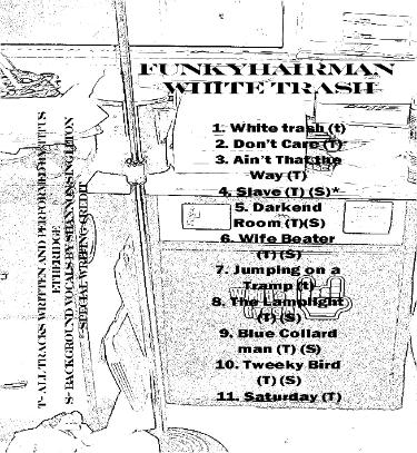 | The Funkyhairman Album White Trash This is my interpretation of the mulitino Californian half hippie half Mexican mostly stoner, beer drinker, that I have come to know and rebel with , and against in some time or another down the winding road of my vibrant life. The consciousness that I have envisioned for this album is one of experience that I have had in the interpretation of people from my own time and place as well as mixed with the diluted perception others have whisked upon me as well as the way I sometimes see my self. I hope you enjoy a moment in my emotional mind because this is where the soul of the music lies. |